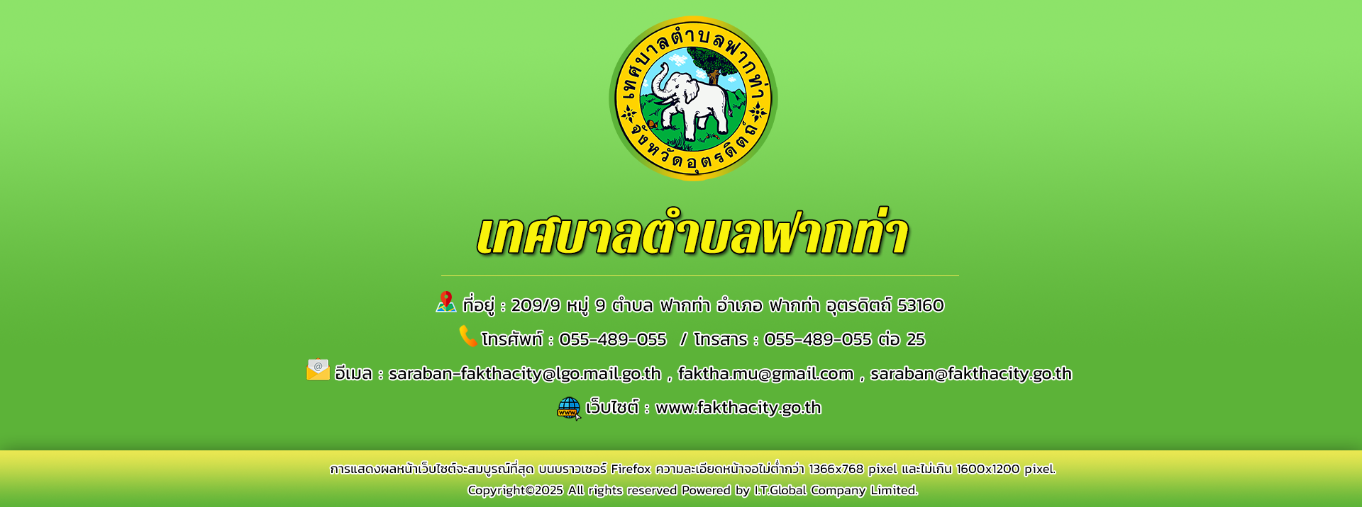 ยินดีต้อนรับเข้าสู่ สำนักงานเทศบาลตำบลฟากท่า ติดต่อสอบถาม : โทรศัพท์ : 055-489-055 / โทรสาร (แฟกซ์) : 055-489-055 ต่อ 25 อีเมล์ : saraban-fakthacity@lgo.mail.go.th , faktha.mu@gmail.com , saraban@fakthacity.go.th
